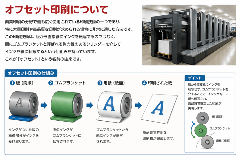 商業印刷の分野で最も広く使用されている印刷技術の一つであり、特に大量印刷や高品質な印刷が求められる場合に非常に適した方法です。