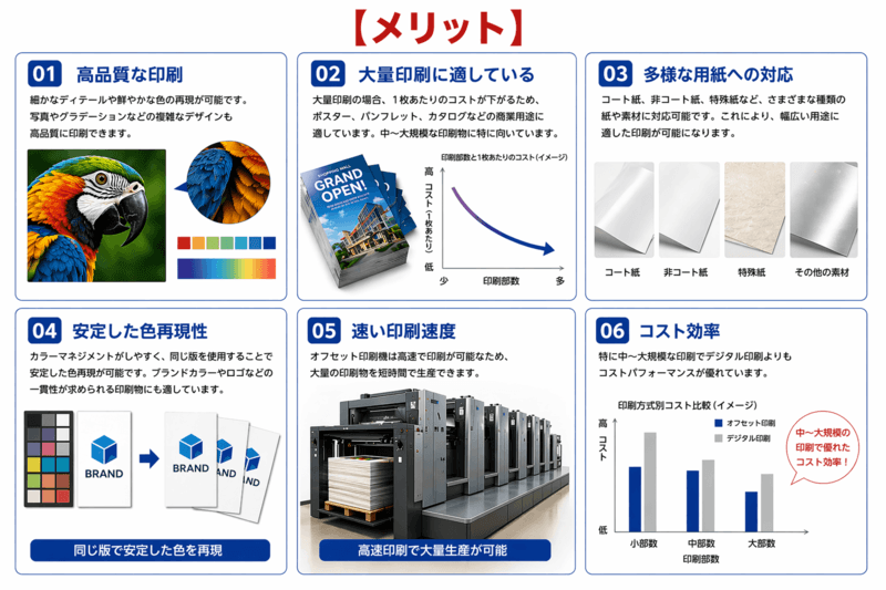 カラーマネジメントがしやすく、同じ版を使用することで安定した色再現が可能です。ブランドカラーやロゴなどの一貫性が求められる印刷物にも適しています。