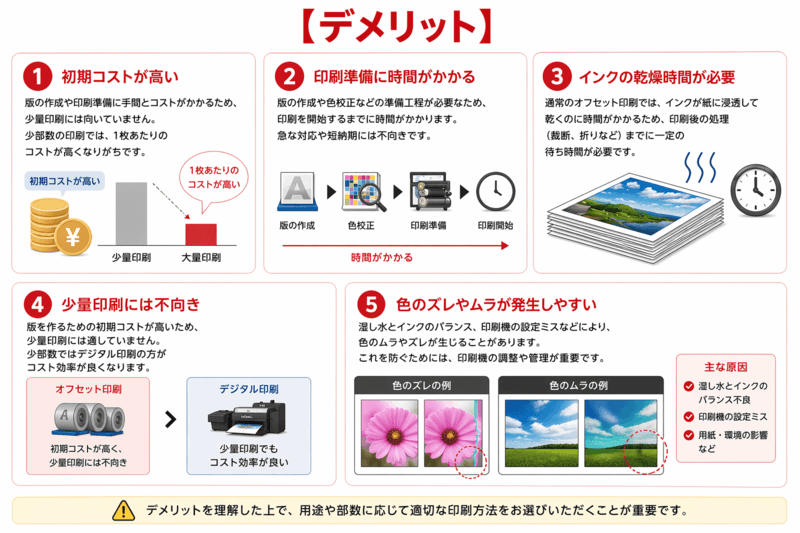 版を作るための初期コストが高いため、少量印刷には適していません。少部数ではデジタル印刷の方がコスト効率が良くなります。