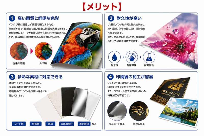 ただし、UVインキは通常のインキと比較してコストが高く、シアンやマゼンタなどの色の再現性にやや問題がある場合があります。