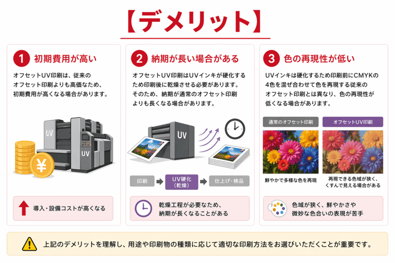 UVインキは硬化するため印刷前にCMYKの4色を混ぜ合わせて色を再現する従来のオフセット印刷とは異なり、色の再現性が低くなる場合があります。